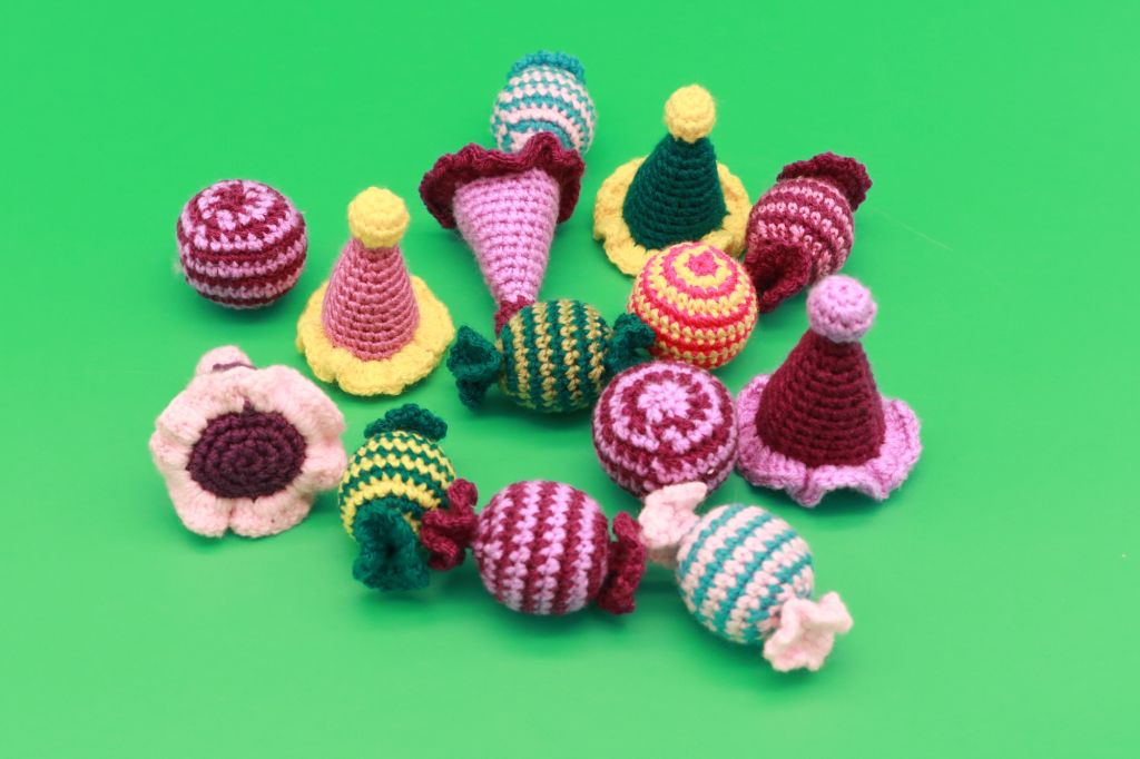 Hier finden Sie ein Beispielbild unserer Hexenhüte, Bonbons oder Bälle mit Glöckchen (mit oder ohne Baldrian).